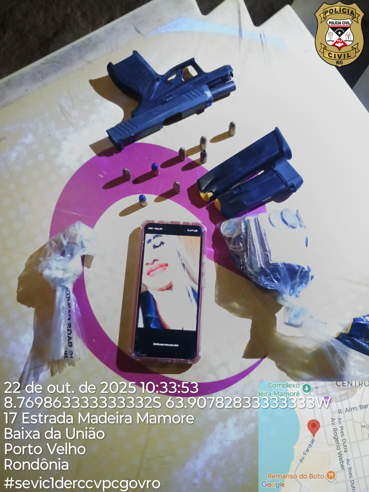 A mulher foi detida em um cabaré localizado ao lado da residência onde o homicídio foi cometido. No momento da ação, os policiais apreenderam dois elementos cruciais para o caso: uma pistola calibre 9mm, que seria a arma utilizada no crime, e porções de entorpecentes.