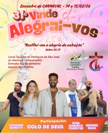 Pelo 31º ano a Renovação Carismática Católica (RCC) - Regional Ji-Paraná, realiza o Carnaval em Cristo - Vinde, Alegrai-vos , com o tema 2026 sendo: "Restitui-me a Alegria da Salvação". O evento acontece na quadra de esportes da entidade neste sábado (14) e domingo (15). Informou o coordenador, Carlos Morais.