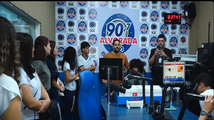 Os estudantes conhecendo os estúdios da Rádio Alvorada (90,7 FM)